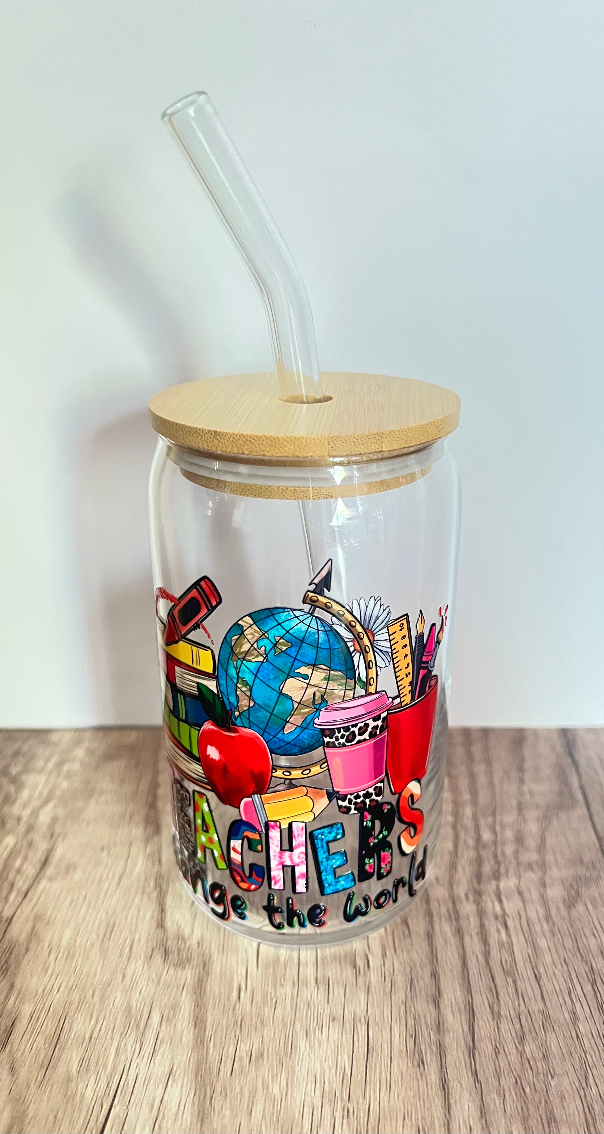 - 16 oz glass cold drink tumbler with bamboo lid and glass drinking straw